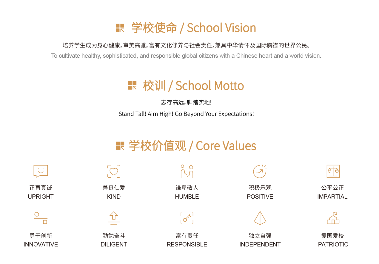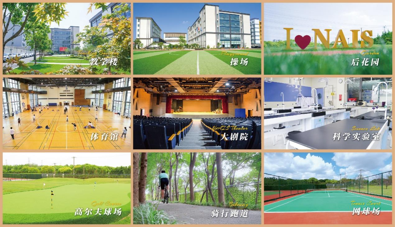 校舍位于闵行区中心地带,占地面积近100亩,主体分为教学楼、艺体楼、生活楼,其中包含图书馆、科学实验室、音乐练习室、美术工作室、烘焙室、戏剧排练厅、多功能报告厅、大剧院、室内体育馆、击剑馆、攀岩墙、健身房、户外运动场、高尔夫练习场、网球场、骑行环道、校内餐厅、咖啡吧等设施设备,卓越的硬件配置为学生提供了顶尖的学习与成长体验。