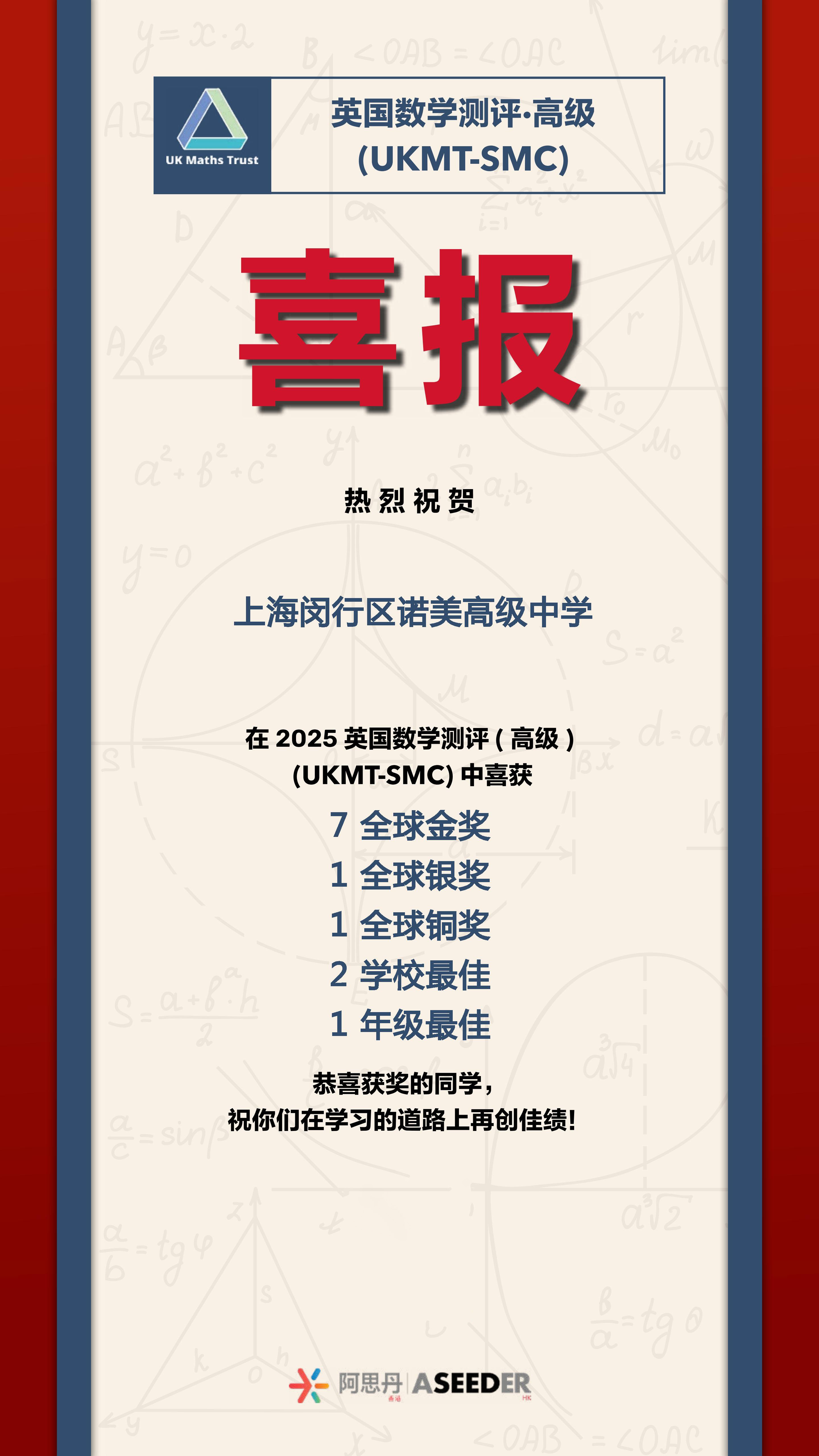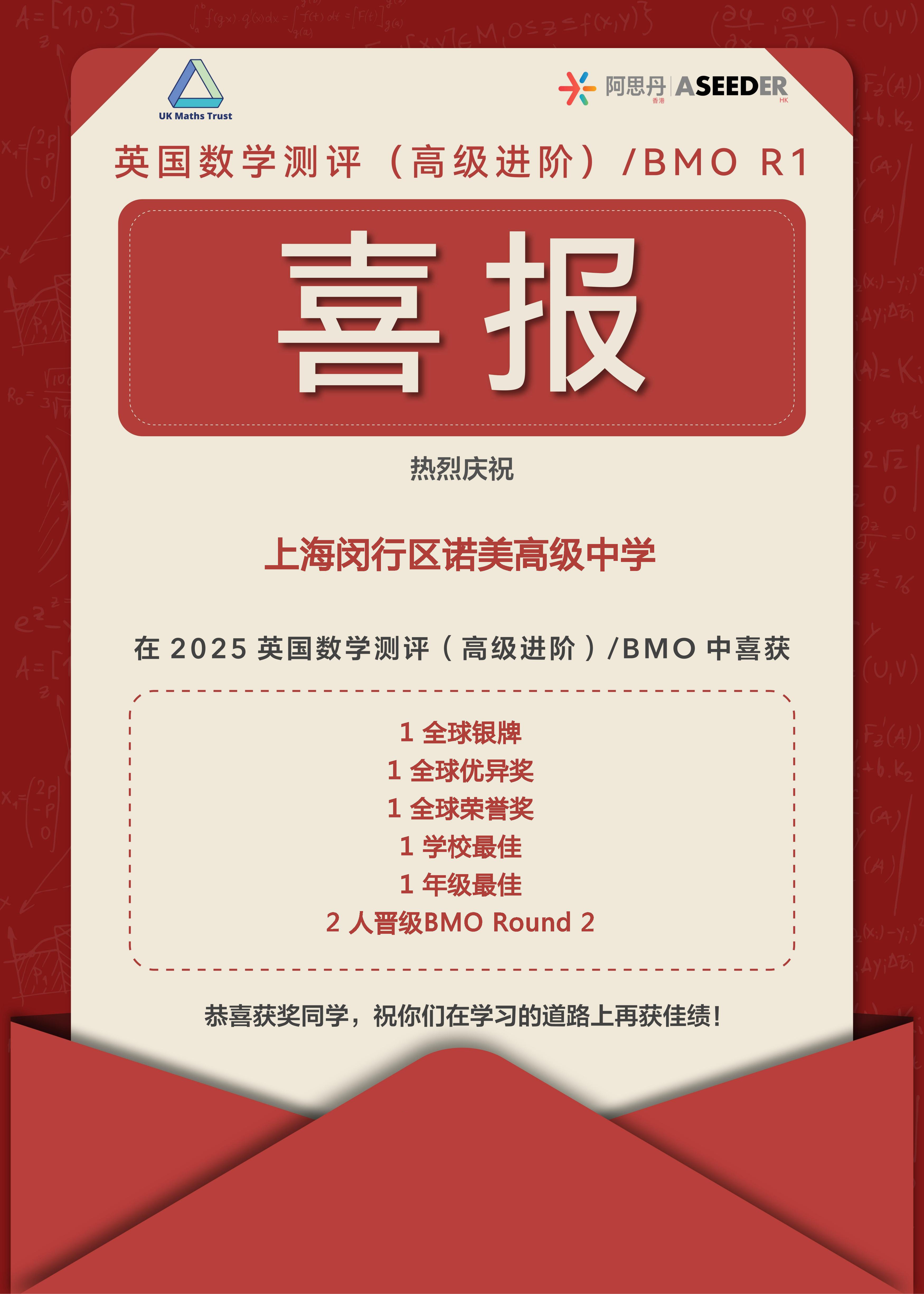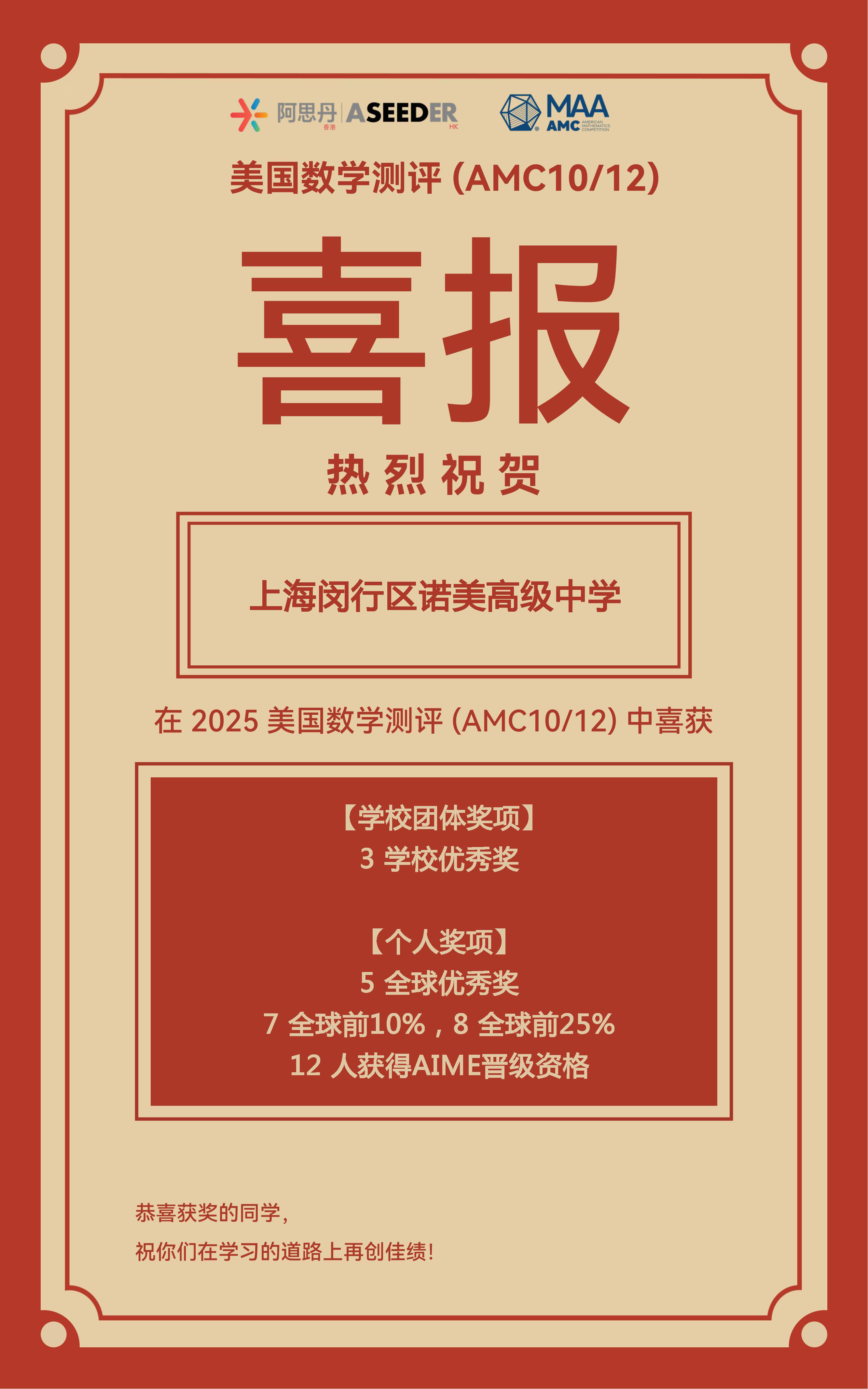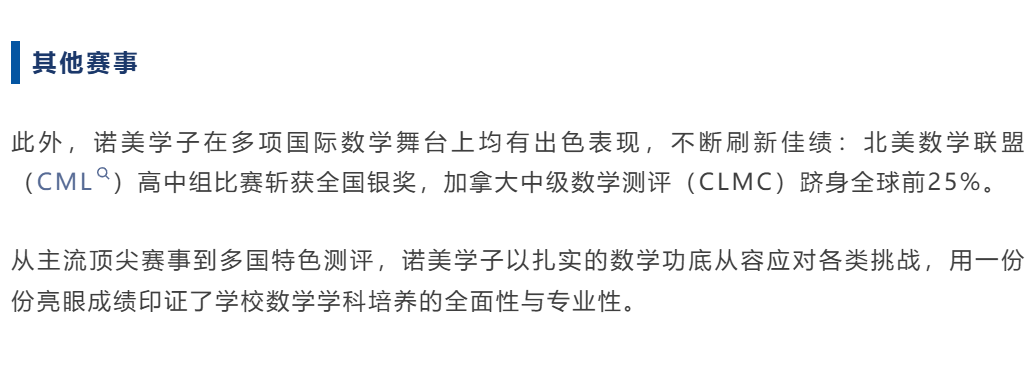 再次祝贺所有在竞赛中斩获佳绩的同学们!这些赛事不仅是智力的竞技场,更是探索未知、连接世界的窗口。每一次解题的凝思,每一轮对抗的协作,都将化为通往未来顶尖学府与科学前沿的坚实阶梯。我们期待诺美学子永葆好奇,勇于挑战,在更广阔的世界舞台上,持续定义卓越,书写下一个传奇篇章。
