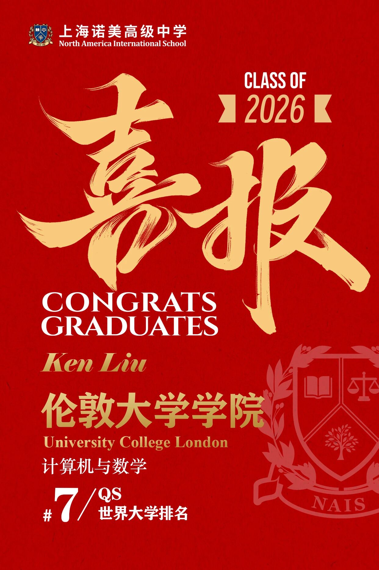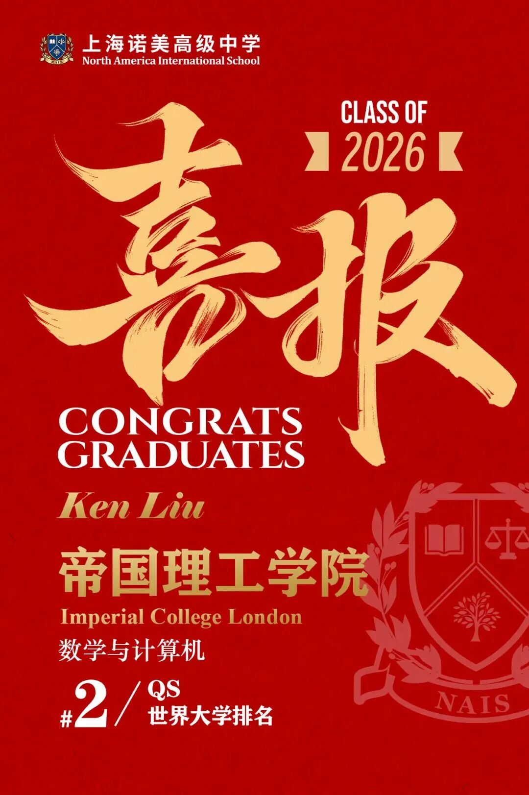 ??Ken Liu同学荣获帝国理工学院数学与计算机专业录取offer