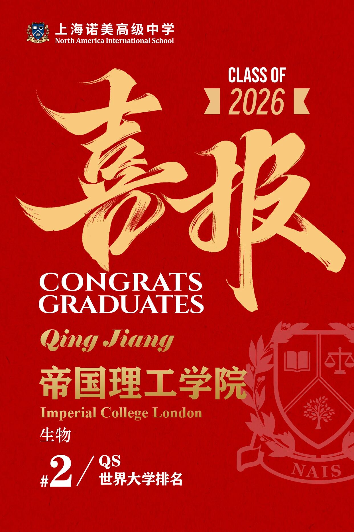 ??Qing Jiang同学荣获帝国理工学院生物专业录取offer