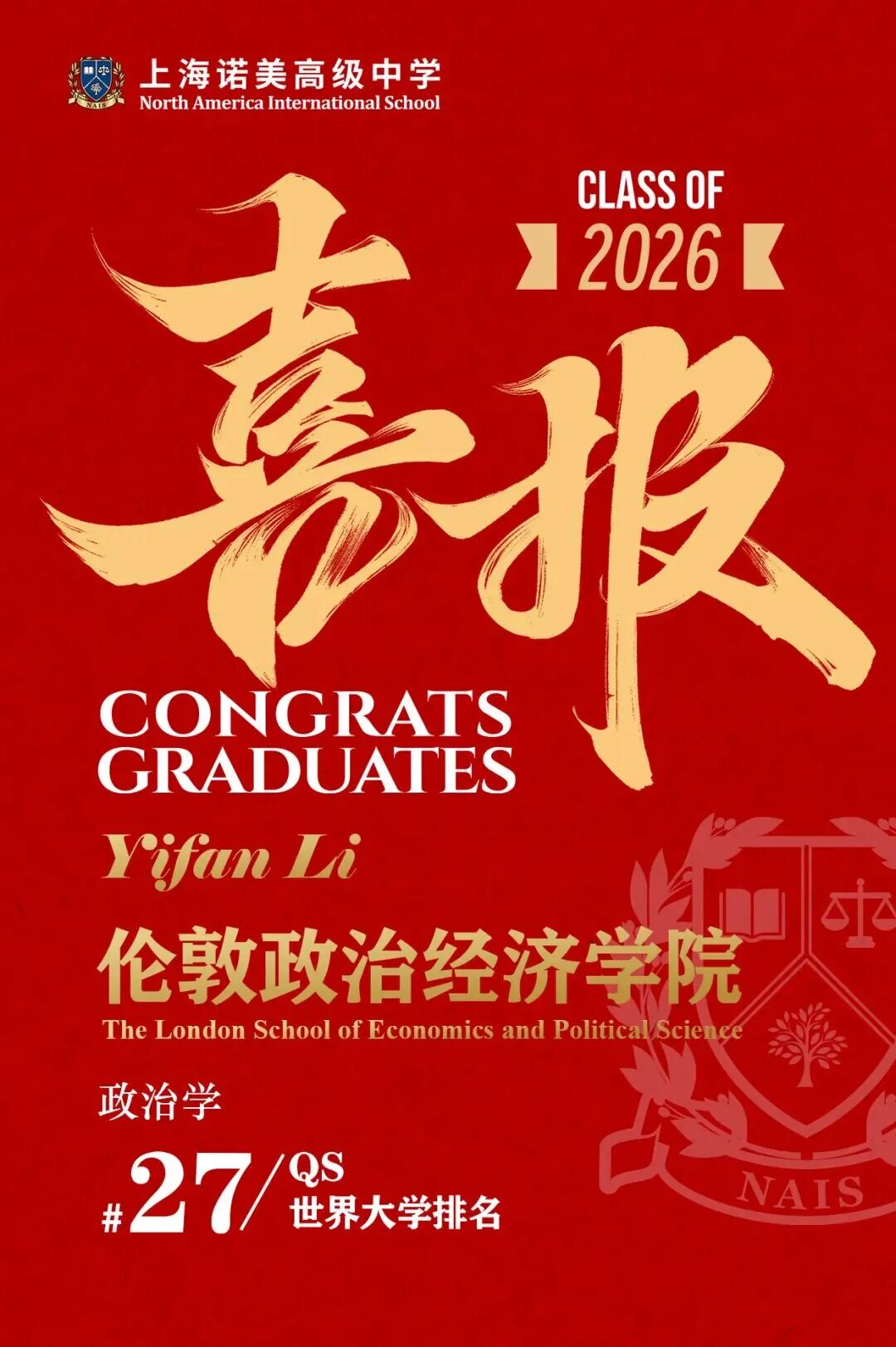 ??Yifan Li同学荣获伦敦政治经济学院政治学专业录取offer