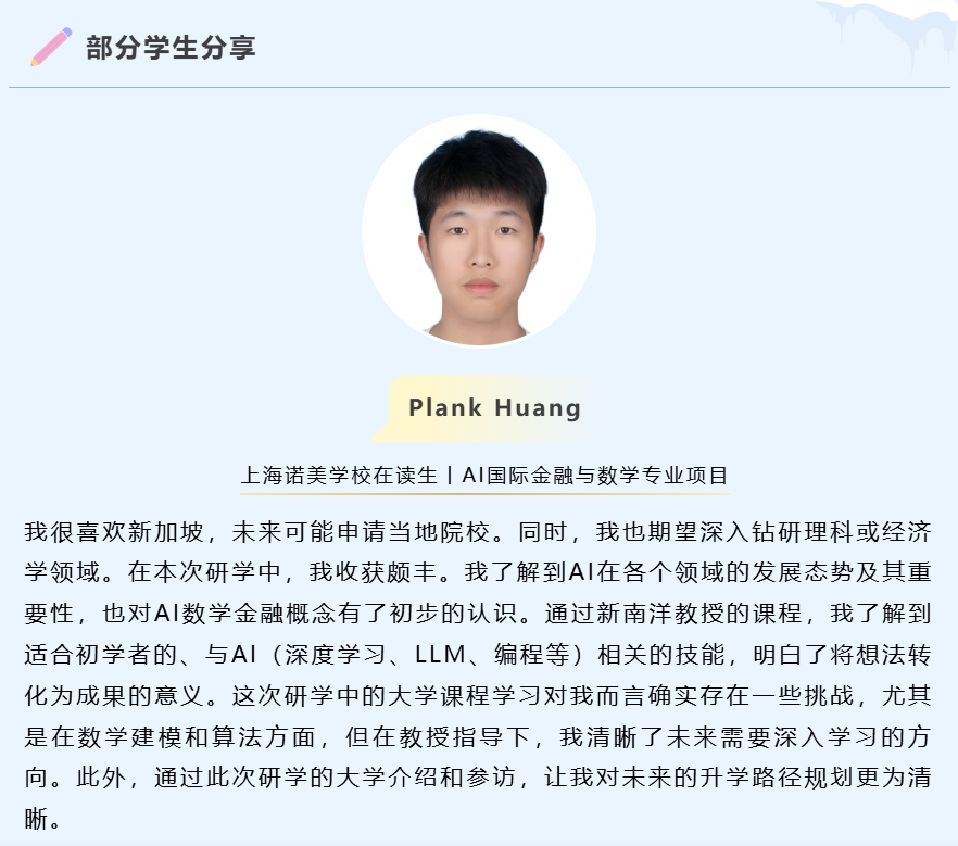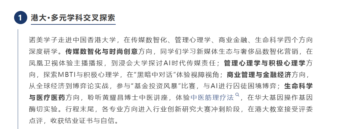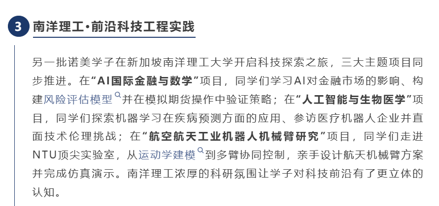 寒意料峭,挡不住求知的热情。这个寒假,诺美学子再次背起行囊,奔赴全球顶尖学术殿堂。从香港大学的多元课堂到南加州大学的前沿商科,从新加坡南洋理工的尖端实验室到人工智能与金融的交叉领域,同学们在行走中学习,在探索中成长,将世界变成自己的课堂。