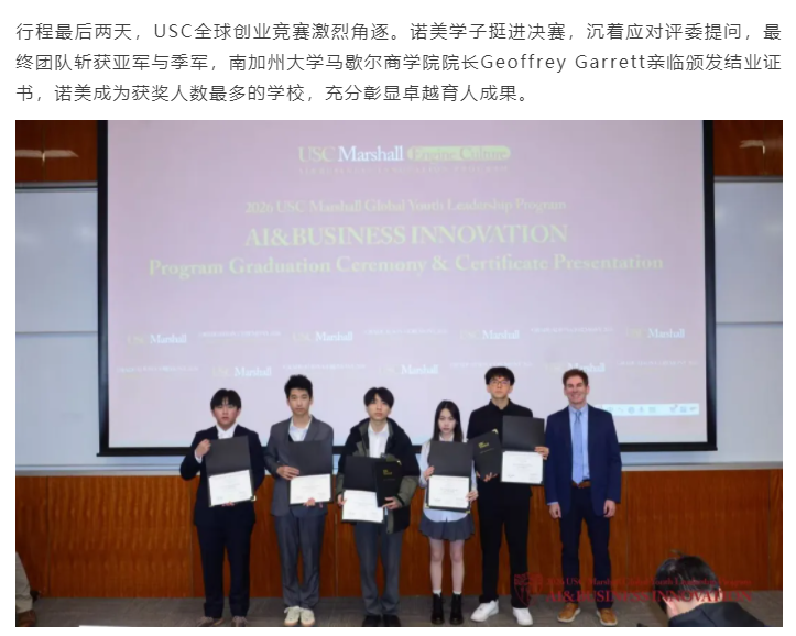 从港大到南加大,从南洋理工到狮城街头,诺美学子在研学中收获了知识、友谊与成长。当旅程结束,带回来的不仅是荣誉证书,更是一份对未来的清晰规划,以及面对挑战时的从容与自信。这段经历终将成为他们走向世界舞台的重要基石。