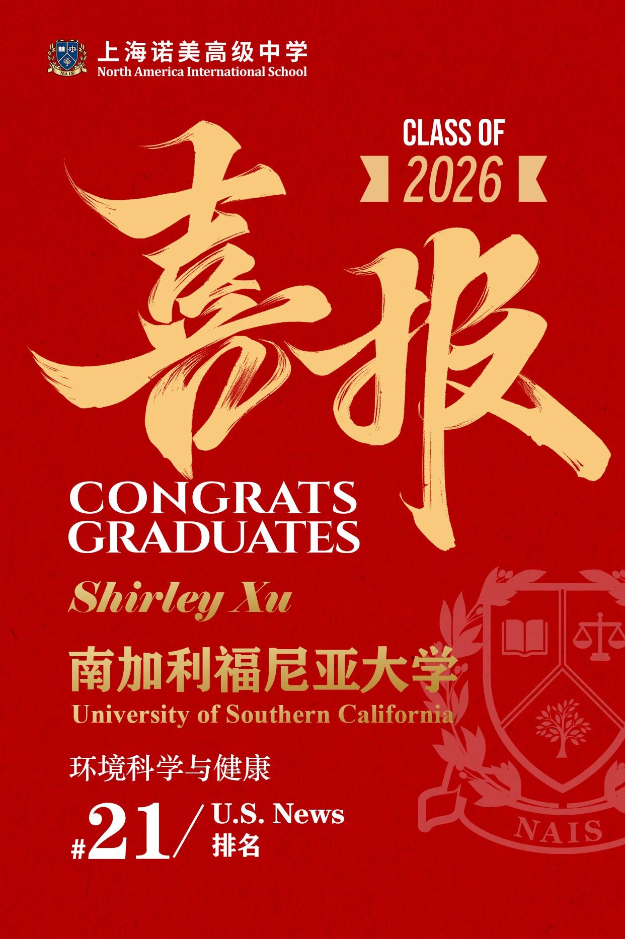 热烈祝贺——?? Shirley Xu 同学荣获南加利福尼亚大学环境科学与健康专业录取offer!