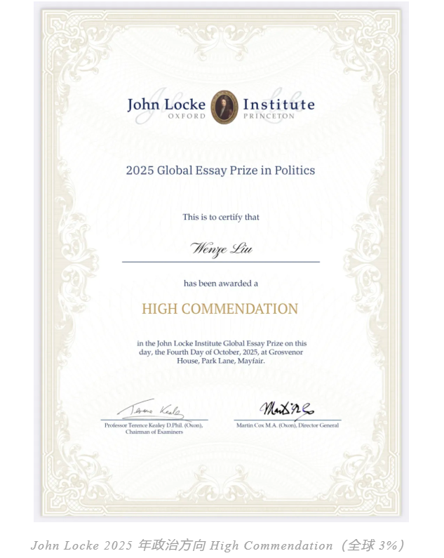 确定专业方向后,诺美升导老师为我推荐了有着“人文社科竞赛天花板”之称的约翰?洛克论文竞赛(John Locke Institute Essay Competition),并全程悉心指导。最终,我凭借扎实的研究与写作,斩获 John Locke 2025 政治方向 High Commendation(全球3%)。